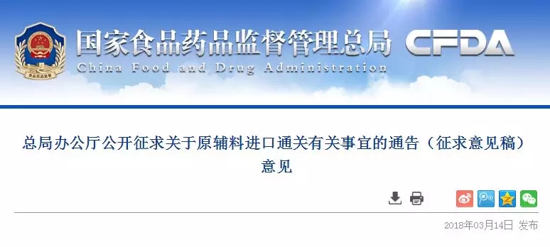 根據《國務院關于取消一批行政許可事項的決定》(國發〔2017〕46號)、國家食品藥品監督管理總局《關于調整原料藥、藥用輔料和藥包材審評審批事項的公告》(2017年第146號),為規范原料藥及藥用輔料的進口通關,國家食品藥品監督管理總局組織起草了《關于原輔料進口通關有關事宜的通告(征求意見稿)》,現向社會公開征求意見。請于2018年3月28日前,將意見反饋至電子郵箱hxypc@cfda.gov.cn,并注明郵件主題“原輔料進口通關通告意見”。