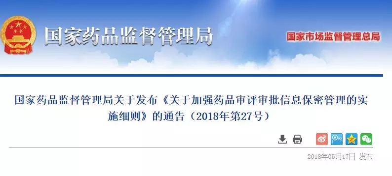 為維護藥品注冊申請人的合法權益,規范和加強審評審批信息保密管理,確保藥品審評審批工作合法高效運行,根據《中華人民共和國藥品管理法》《中共中央辦公廳 國務院辦公廳印發〈關于深化審評審批制度改革鼓勵藥品醫療器械創新的意見〉的通知》《國家食品藥品監督管理總局藥品醫療器械審評審批信息保密管理辦法》等,國家藥品監督管理局制定了《關于加強藥品審評審批信息保密管理的實施細則》,現予發布。