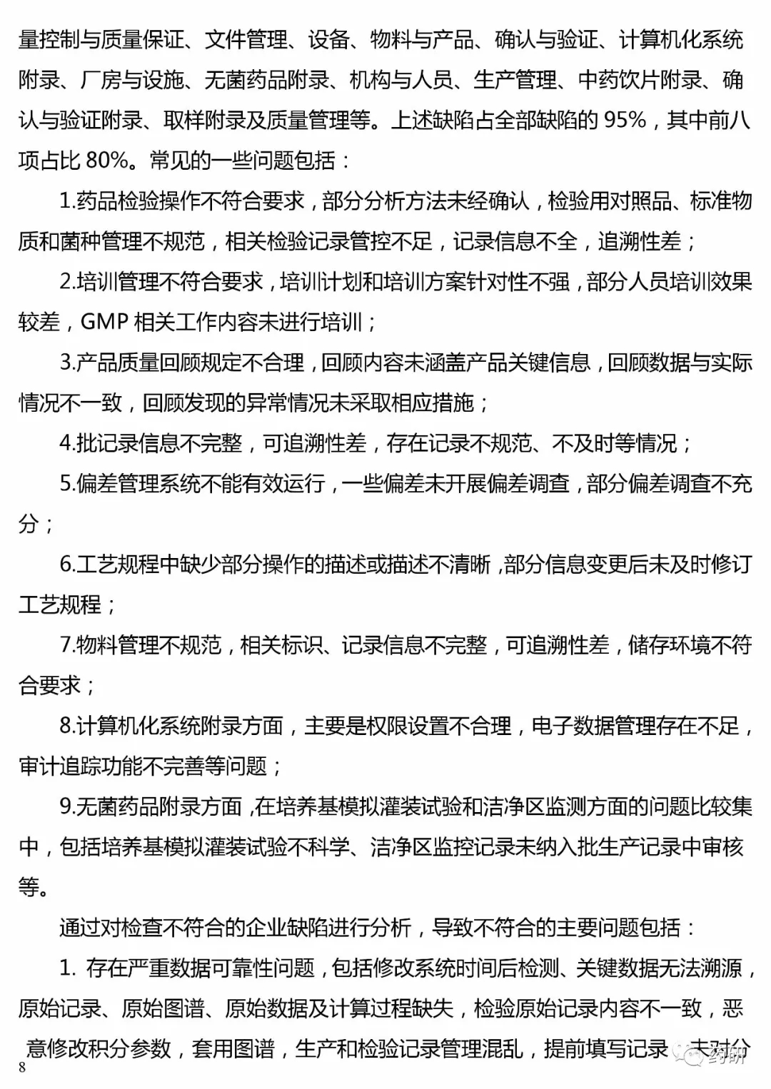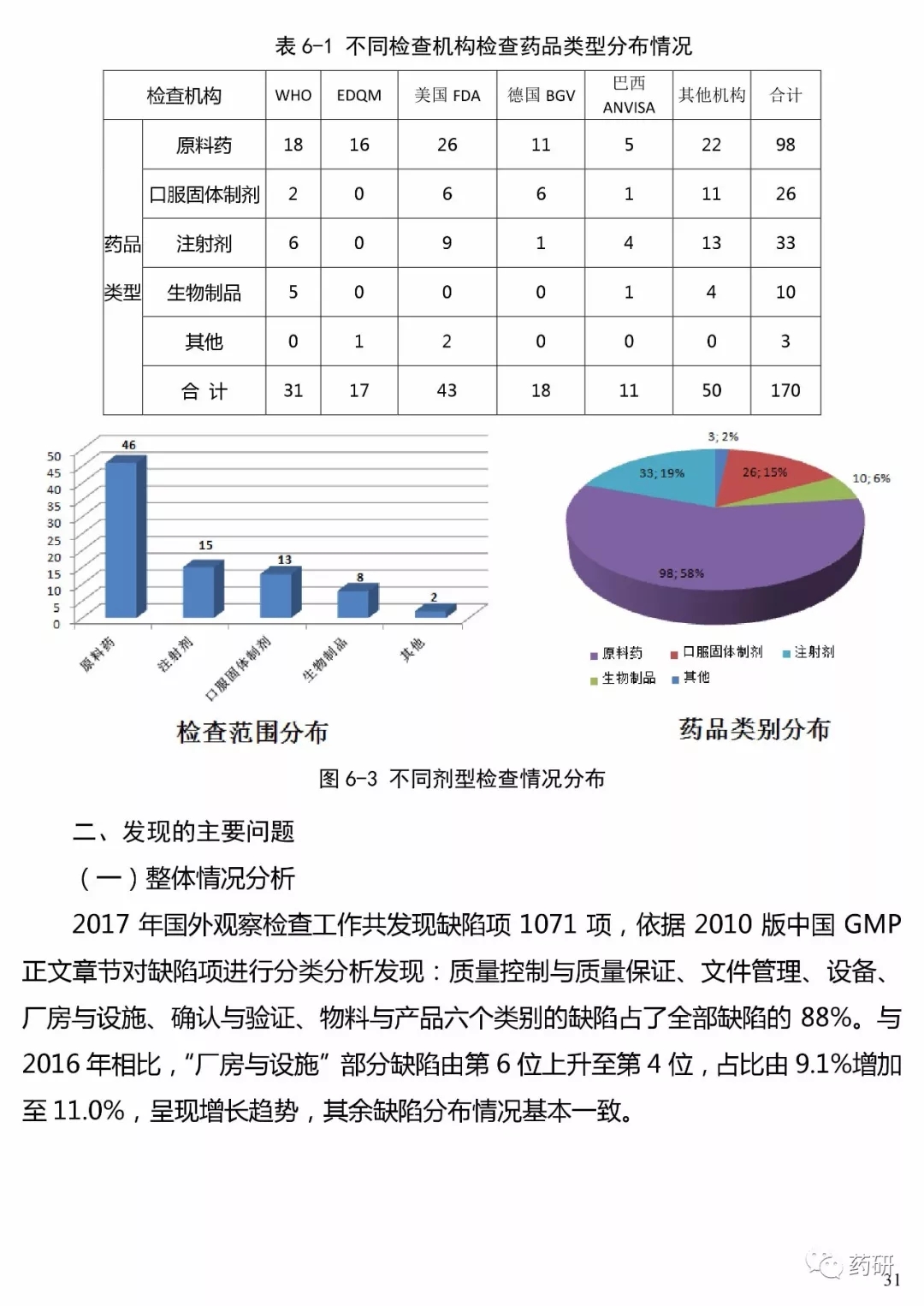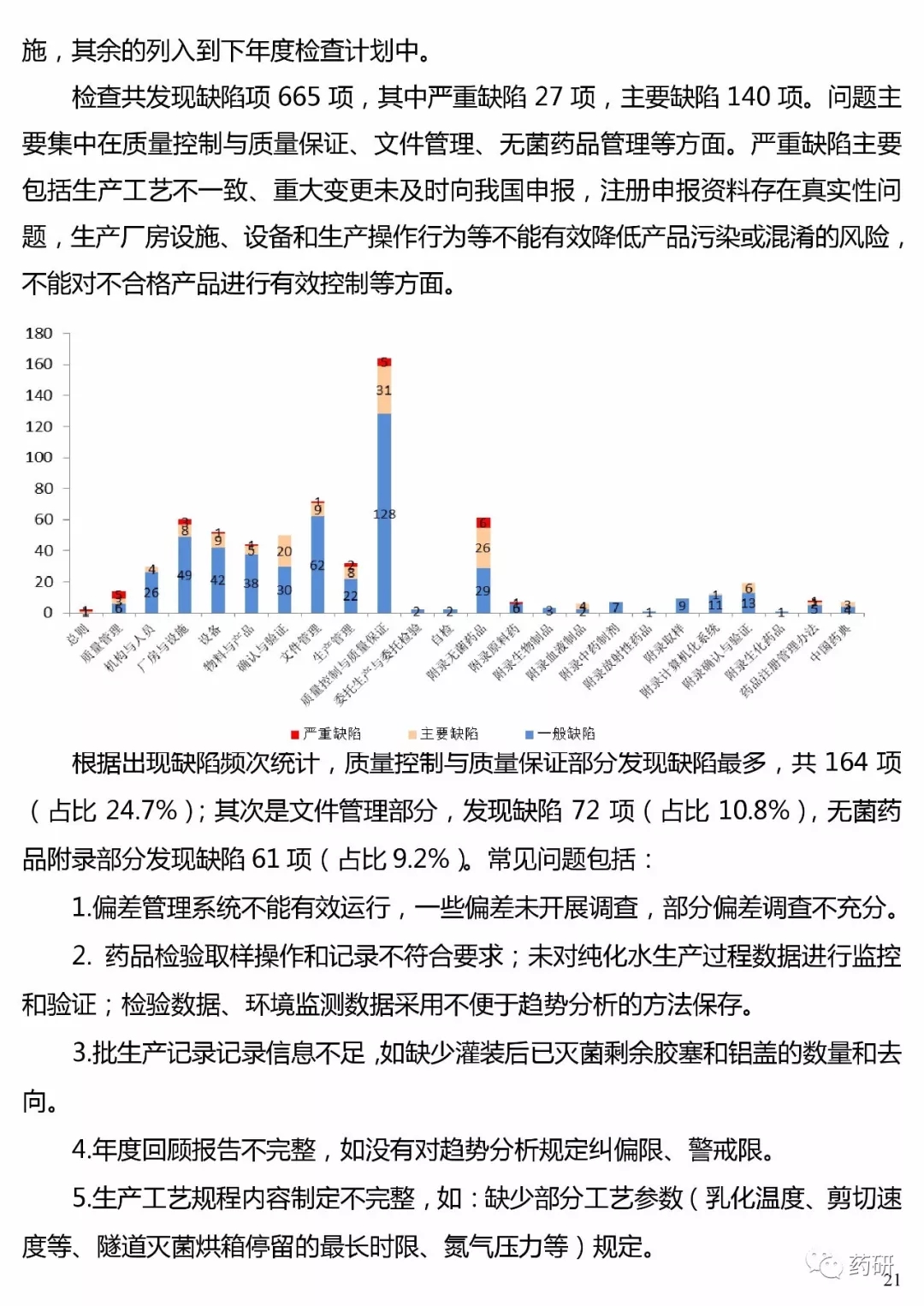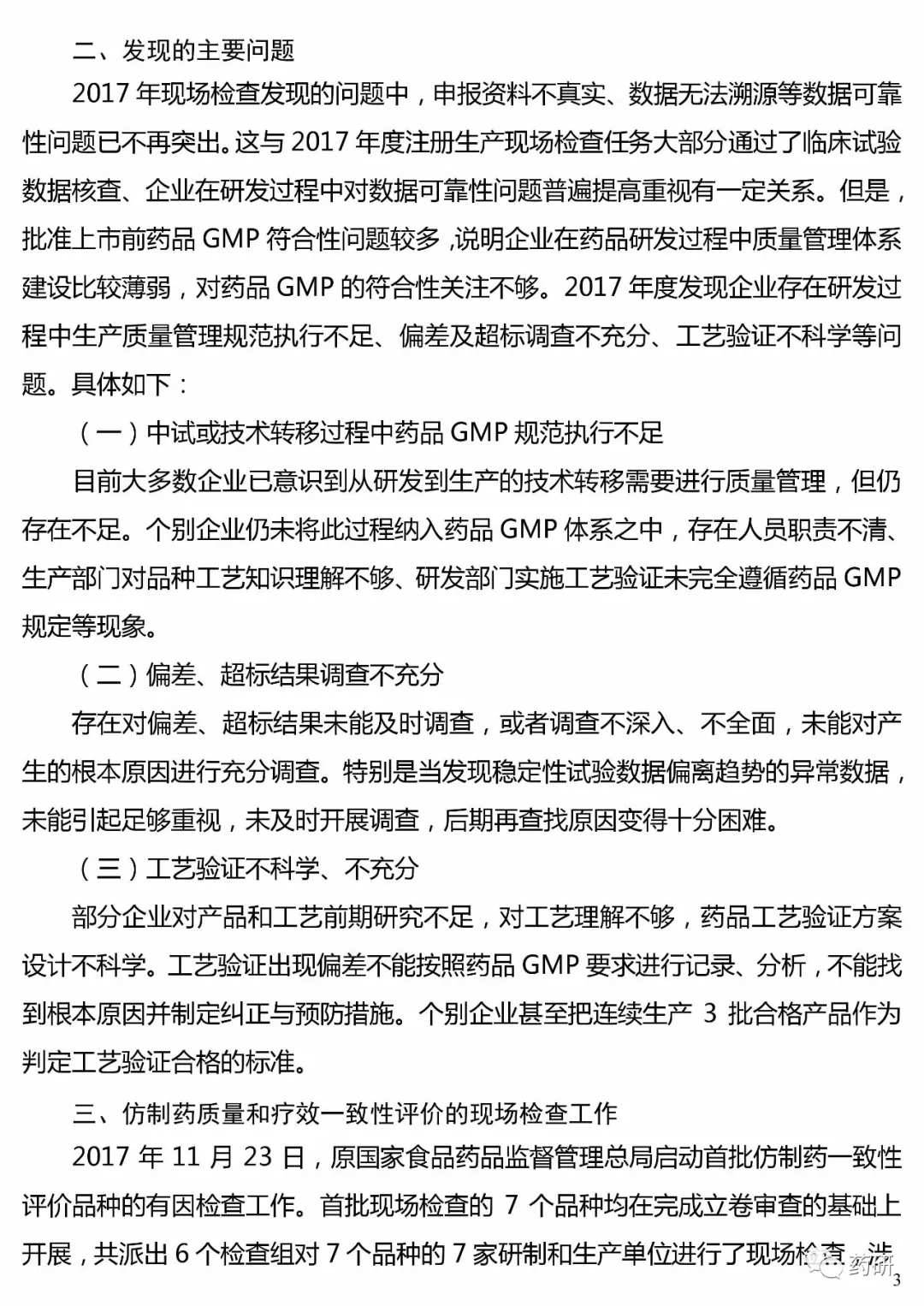為進(jìn)一步加強(qiáng)藥品檢查信息公開,提高檢查工作透明度,國家藥品監(jiān)督管理局對2017年國家開展的藥品注冊生產(chǎn)現(xiàn)場檢查、藥品GMP跟蹤檢查、藥品飛行檢查、進(jìn)口藥品境外生產(chǎn)現(xiàn)場檢查、藥品流通檢查、國際藥品GMP觀察檢查等工作情況進(jìn)行匯總、統(tǒng)計(jì)和分析,形成《2017年度藥品檢查報(bào)告》(中文版、英文版),現(xiàn)予發(fā)布。