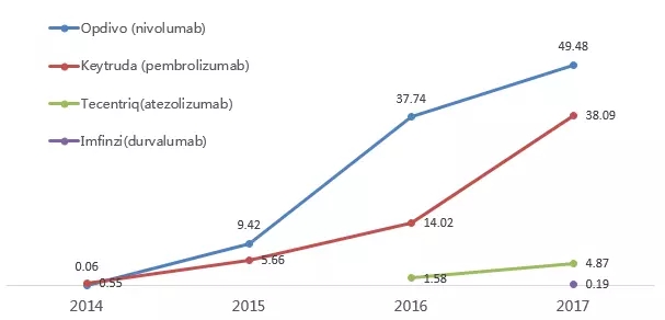 PD-1單抗是腫瘤免疫治療最主流的藥物,自2014年Opdivo首次在日本上市以來,全球共有5個PD-1/PD-L1藥物獲得FDA批準上市,2017年,這5個藥物的全球銷售額累計近100億美元。